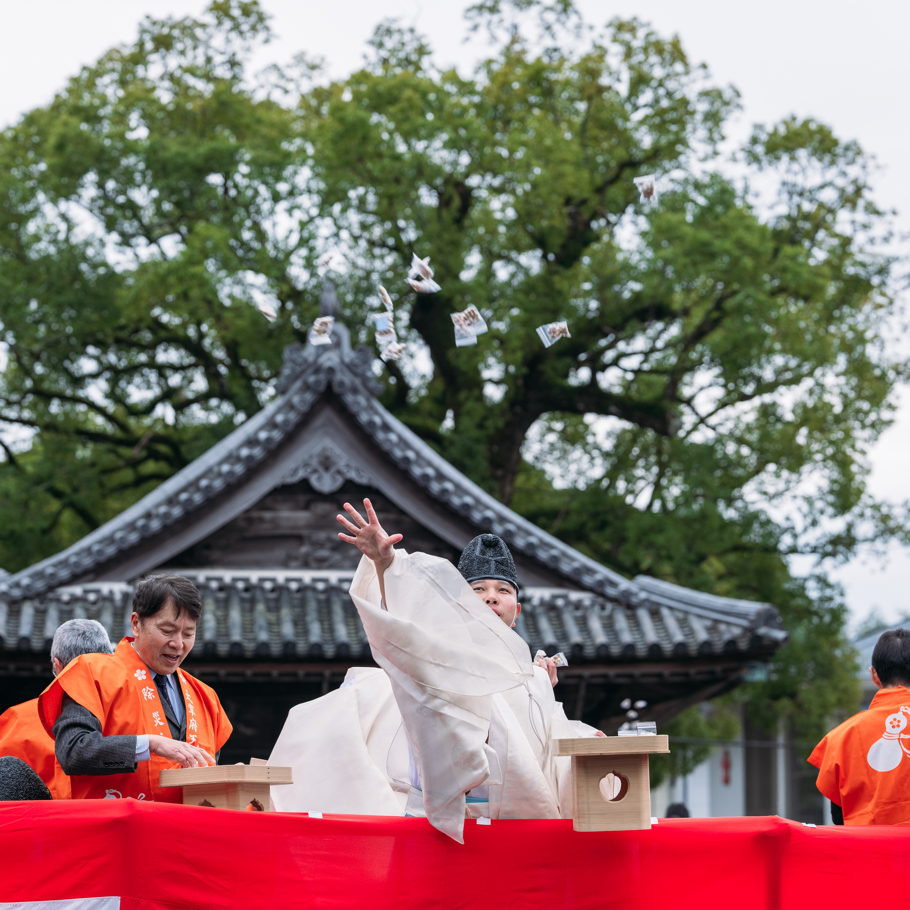 仮殿にて10時30分より祭典が斎行され、天神ひろばにて「豆まき神事(11時頃、14時頃の2回)」を執り行います。