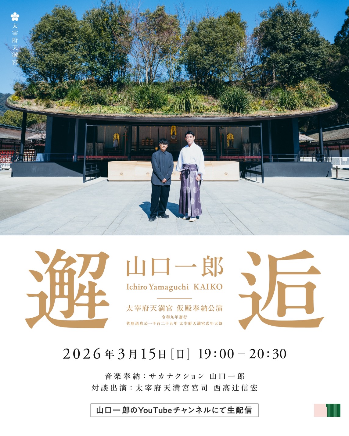 当宮の仮殿にて、山口一郎が音楽奉納を行うほか、当宮宮司・西高辻信宏との対談も予定しております。